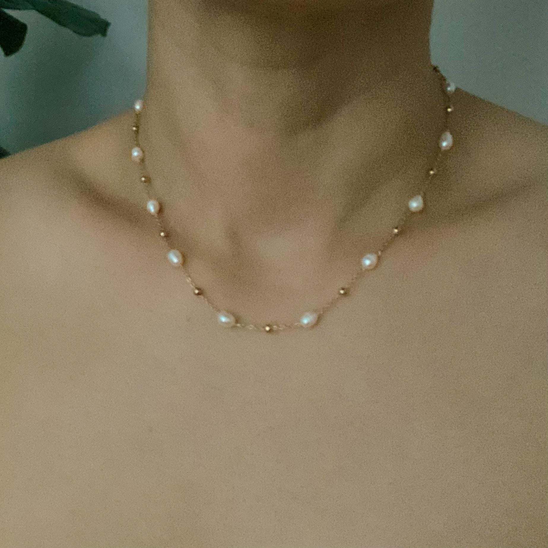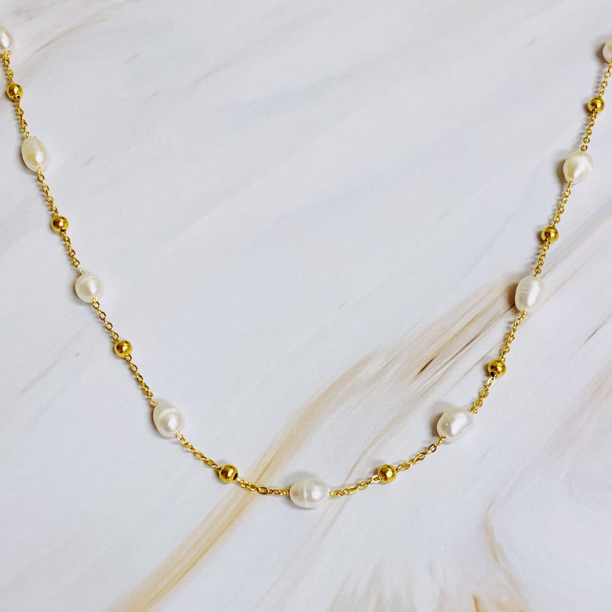 Indulge in the captivating charm of a freshwater pearl necklace, meticulously crafted from premium freshwater pearls and adorned with exquisite gold-plated ball chains. This 15-inch necklace, complete with a 2-inch extender, seamlessly blends classic elegance with modern flair, making it the perfect accessory for any occasion, be it a casual brunch or an elegant evening gala.