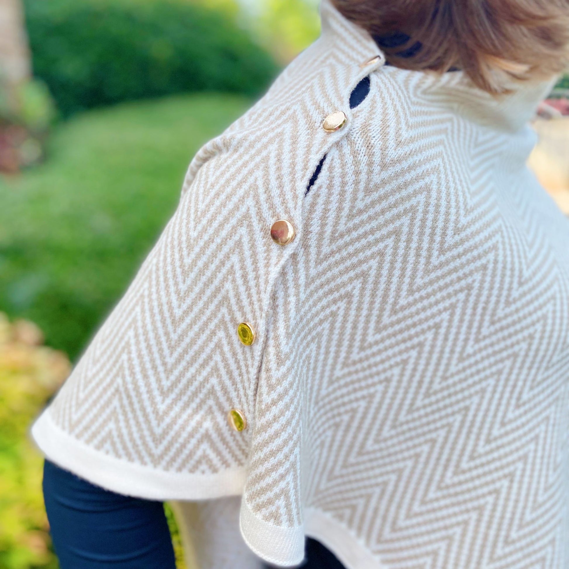 Introducing the Luxe Poncho. Crafted from a sumptuous medium-weight knit blend, this exquisite piece features an eye-catching chevron pattern complemented by elegant gold buttons. Designed for the discerning individual, it effortlessly transitions from a chic poncho to a cozy scarf or stylish cardigan—perfect for any occasion.